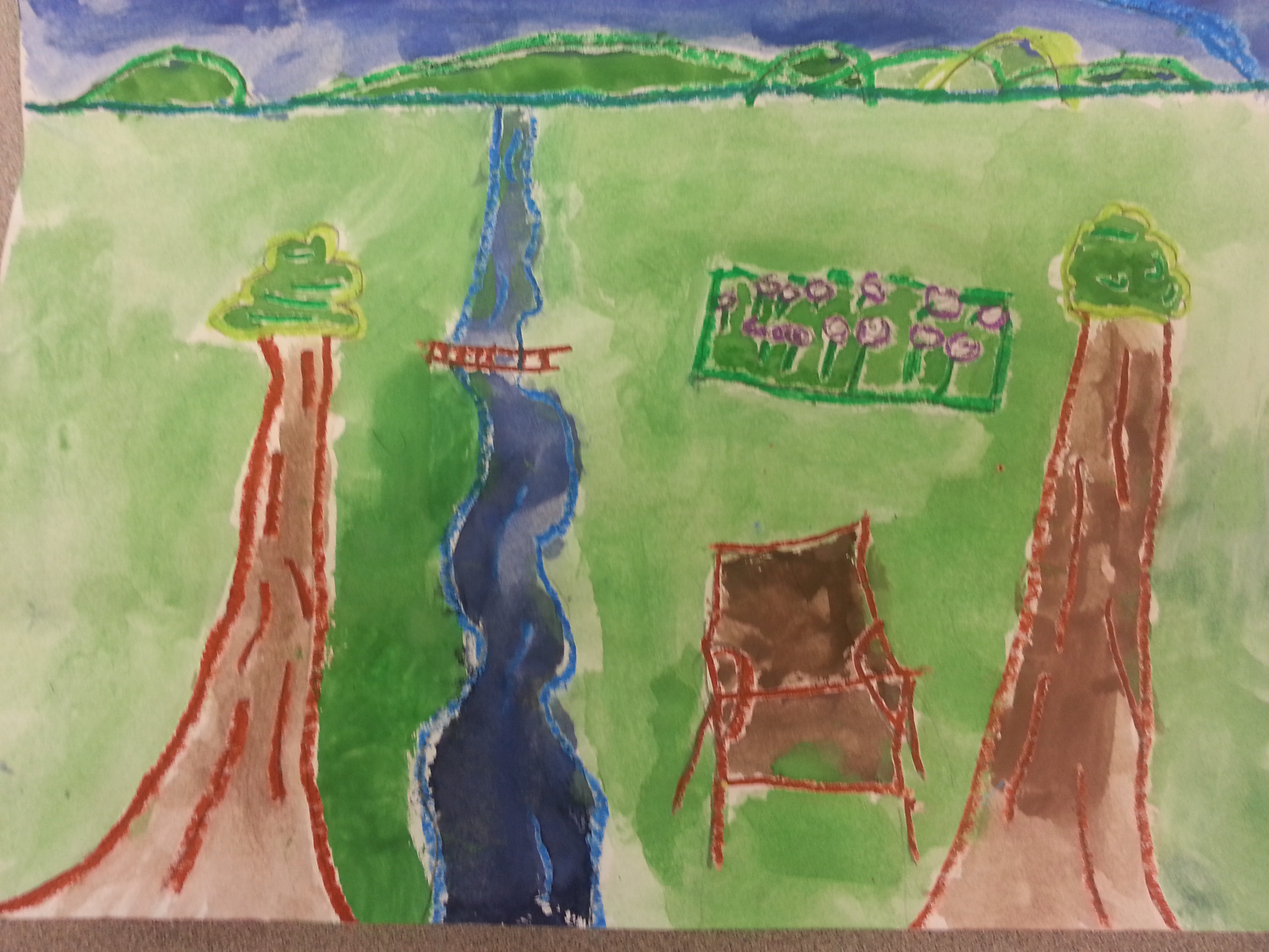 The second grade has been looking at Claude Monet’s landscape and water lily paintings. They learned that objects appear smaller when they are further away. They created landscapes showing distance and using cool colors.