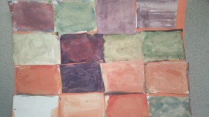 The 2nd grade is learning about Ellsworth Kelly, who created Colors for a Large Wall. This artwork shows 64 canvases placed together to make one artwork. Students are learning about composition (how artwork is arranged), and how to mix the secondary colors. Here’s our color math: