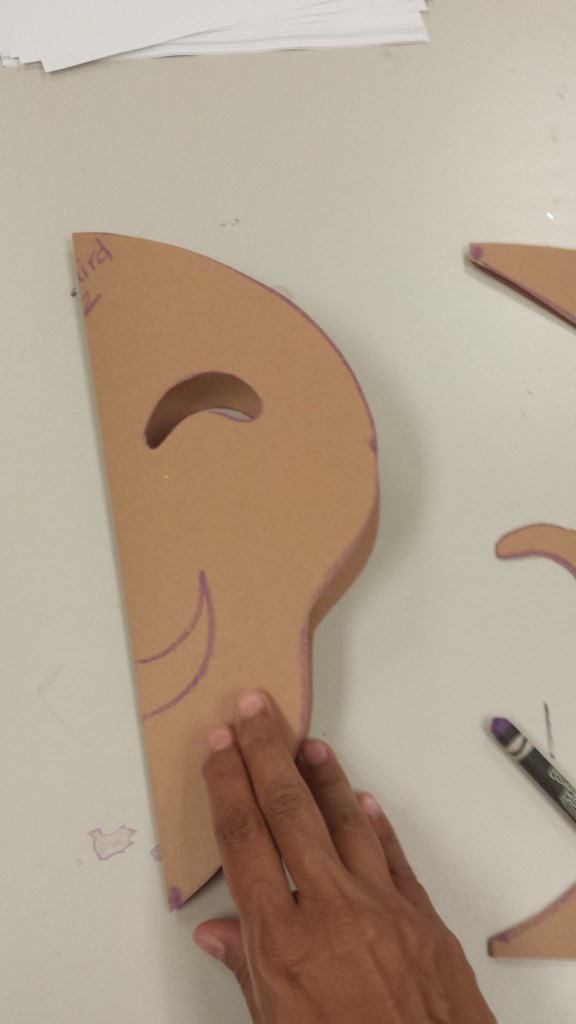 Previous ImageNext Image 20150923_112656 11. Fold your mask again, on the folded side, draw half of a mouth.