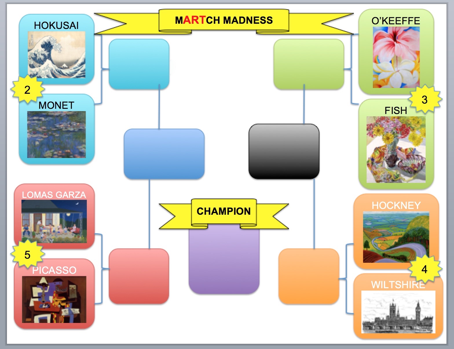 This March, the art room is celebrating a different kind of March Madness. Second through fifth grade classes will participate in mARTch Madness during art classes. Check out which two artists your grade will vote on. In class, you’ll learn a little about each artist and artwork and then…vote!