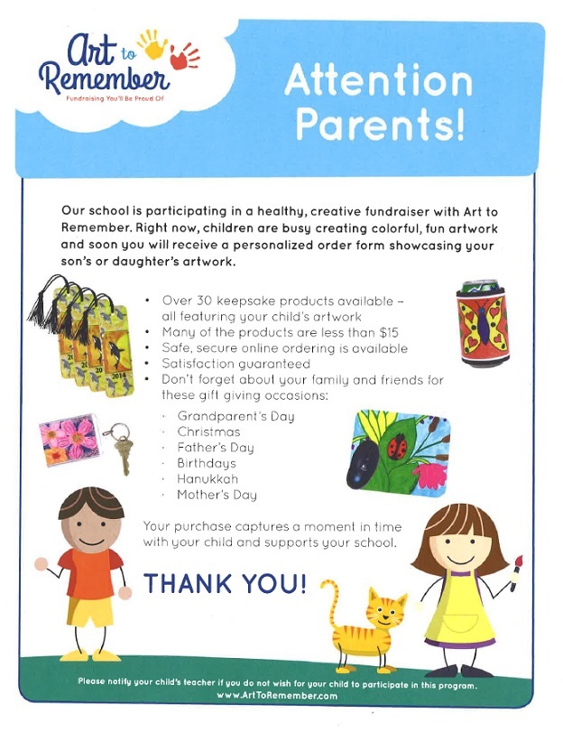 Art to Remember order forms will be sent home on Wednesday, April 8th and must be turned in on Wednesday, April 15th. **5th grade families: if your student is going on the DC trip, please have your orders turned in before leaving Simmons on Monday, April 13th.