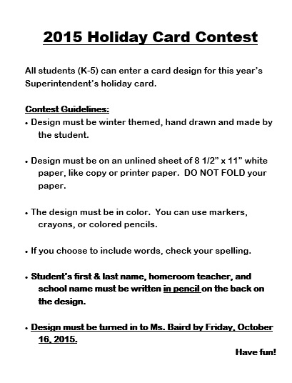 Our Superintendent, Mr. Hawkins, is inviting you to participate in his 2015 Holiday Card Contest. Each year, Mr. Hawkins sends holiday cards to people all over Woodford County. Your artwork could be on the cards! Here are the contest rules: