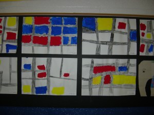 Can you see the streets and buildings in the students’ artworks? All the roads go up and down OR side to side. All the buildings are rectangles or squares.