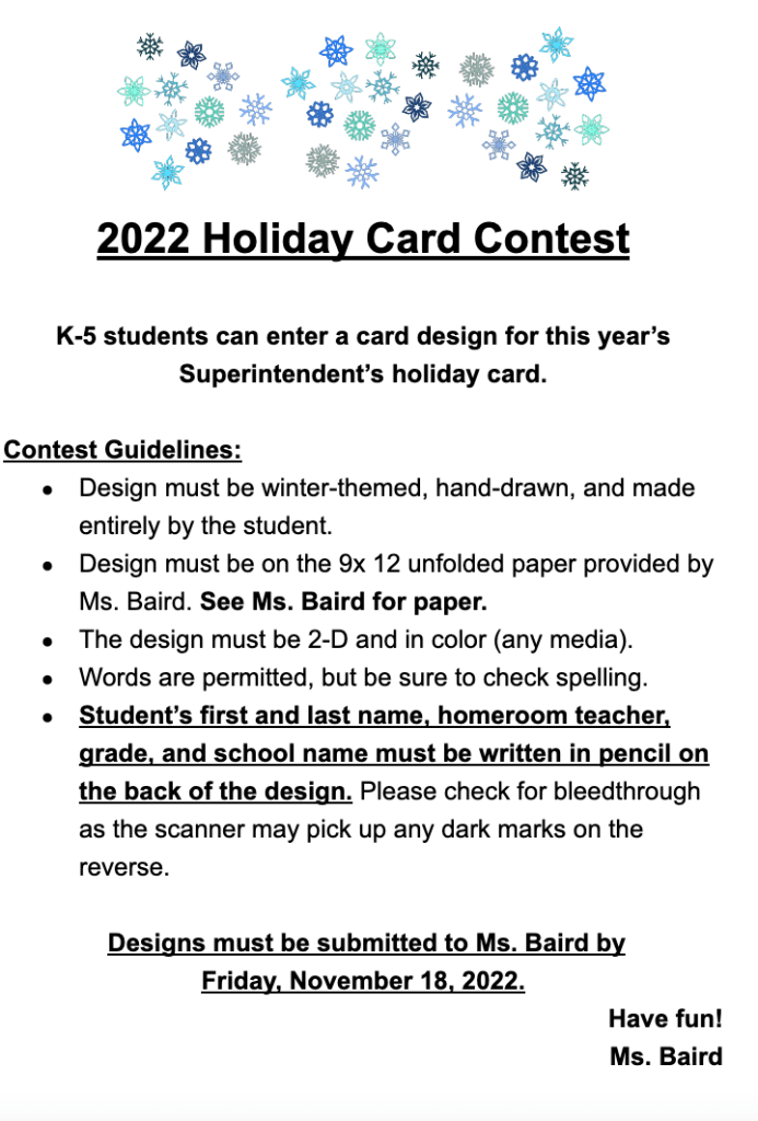 2022 Superintendent’s Holiday Card Contest Share this: Click to share on X (Opens in new window) X Click to share on Facebook (Opens in new window) Facebook Like Loading... Related