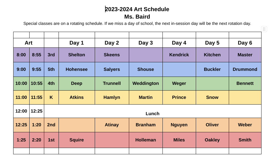 2023-2024 Art Schedule Share this: Click to share on X (Opens in new window) X Click to share on Facebook (Opens in new window) Facebook Like Loading...