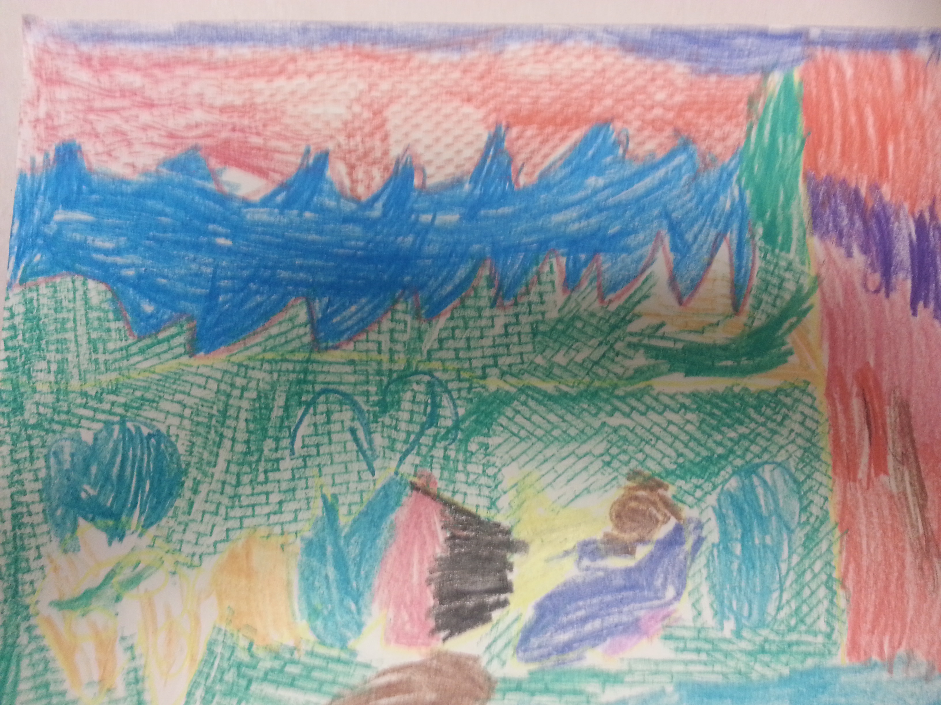 The third grade has been learning about the three types of subject matter: landscape, still life, and portrait. They learned that landscapes have a foreground, middleground, and background. They learned that objects appear smaller when they are further away. We created an imaginatively colored landscape based on David Hockney’s Mulholland Drive.